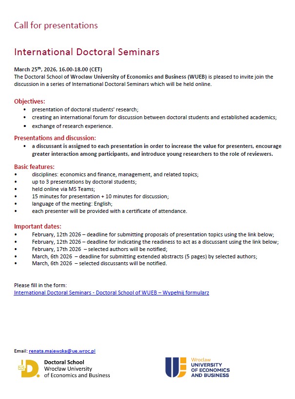XVIII Międzynarodowe Seminarium Doktoranckim organizowane jest przez Szkołę Doktorską Uniwersytetu Ekonomicznego we Wrocławiu w dniu 25 marca 2026 roku.